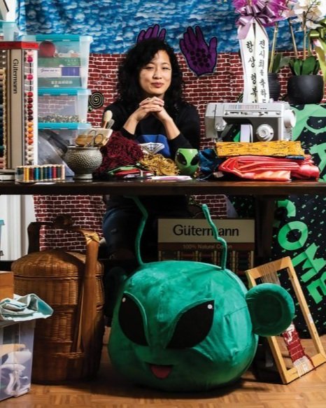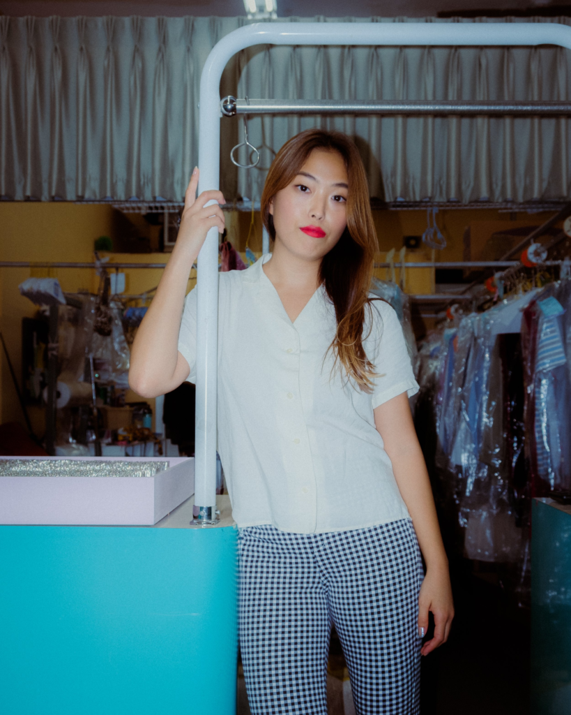wears her fashion garment fabricated with tags from her immigrant parents’ dry cleaner.