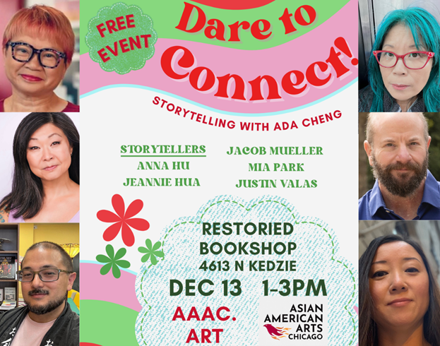 Hear compelling personal stories from Ada Cheng’s students Anna Hu, Jeannie Hua, Jacob Mueller, Mia Park, Justin Valas and her “Dare To Connect!” online storytelling class. No RSVP needed for this free, in-person event at Restoried Bookshop, 4613 N Kedzie Ave, Chicago, IL. Restoried Bookshop is an independent, family-owned, Asian American-owned bookstore.